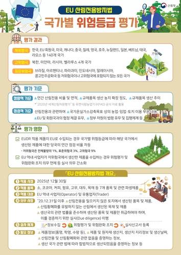 한국이 유럽연합(EU) 'EU 산림전용방지법(EUDR)' 국가별 위험등급에서 저위험국으로 분류됐다.