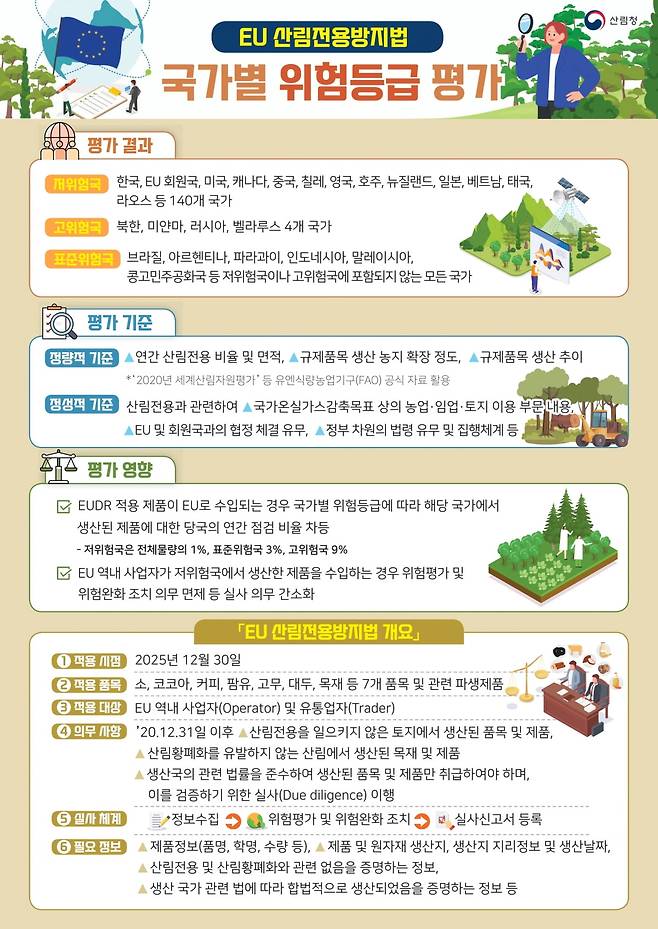 산림청은 유럽연합(EU)이 최근 EU 산림전용방지법(EUDR) 국가별 위험등급을 발표하면서 한국을 저위험국으로 분류했다고 27일 밝혔다.