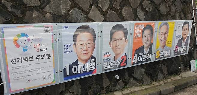 | ▲ 22대 대통령 후보자들 사진 벽보 제주도 서귀포시 호근서로로에 내걸린 선거관리위원회가 제작하여 부착한 제22대 대통령 선거 후보자들의 벽보이다. |