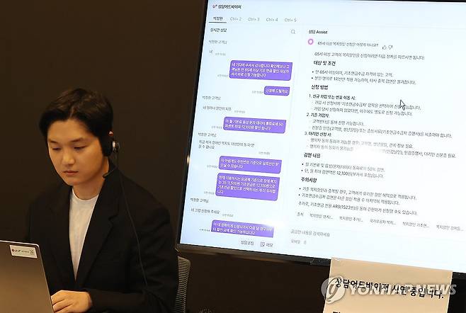 (서울=연합뉴스) 이재희 기자 = 27일 서울 용산구 LG유플러스 사옥에서 관계자가 AI 상담 어드바이저를 활용한 고객 전화 상담을 시연하고 있다. 2025.5.27