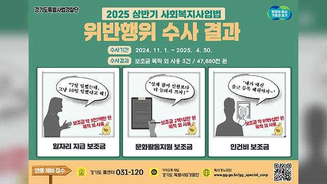사회복지사업법 위반 관련 불법행위는 공익제보 핫라인(hotline.gg.go.kr), 경기도콜센터(☎ 031-120), 카카오톡채널(경기도특별사법경찰단)을 통해 신고하면 됩니다.