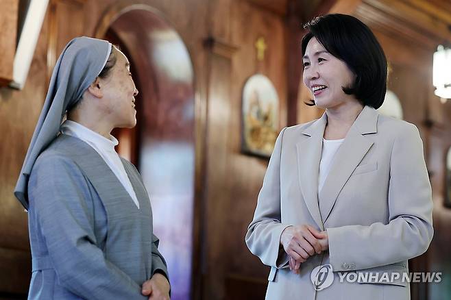 (고흥=연합뉴스) 정다움 기자 = 27일 오전 전남 고흥군 소록도 내 성당에서 더불어민주당 이재명 대선 후보의 배우자 김혜경 여사가 한 수녀와 이야기를 나누고 있다. 2025.5.27
