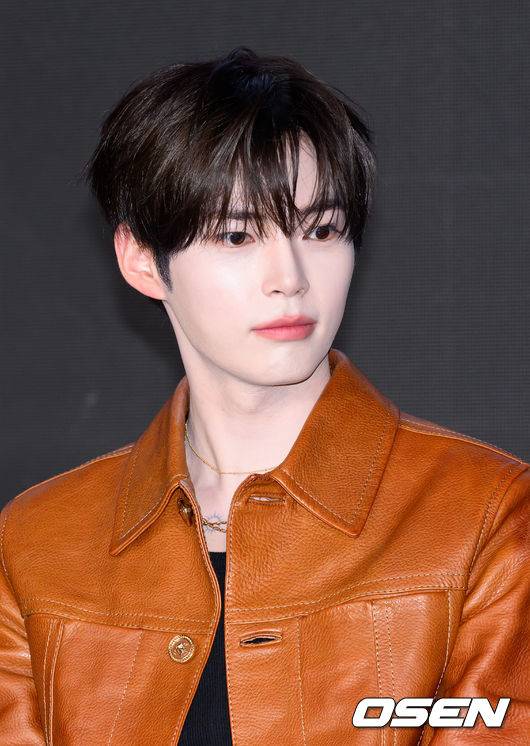 제로베이스원 성한빈이 취재진의 질문을 듣고 있다.
