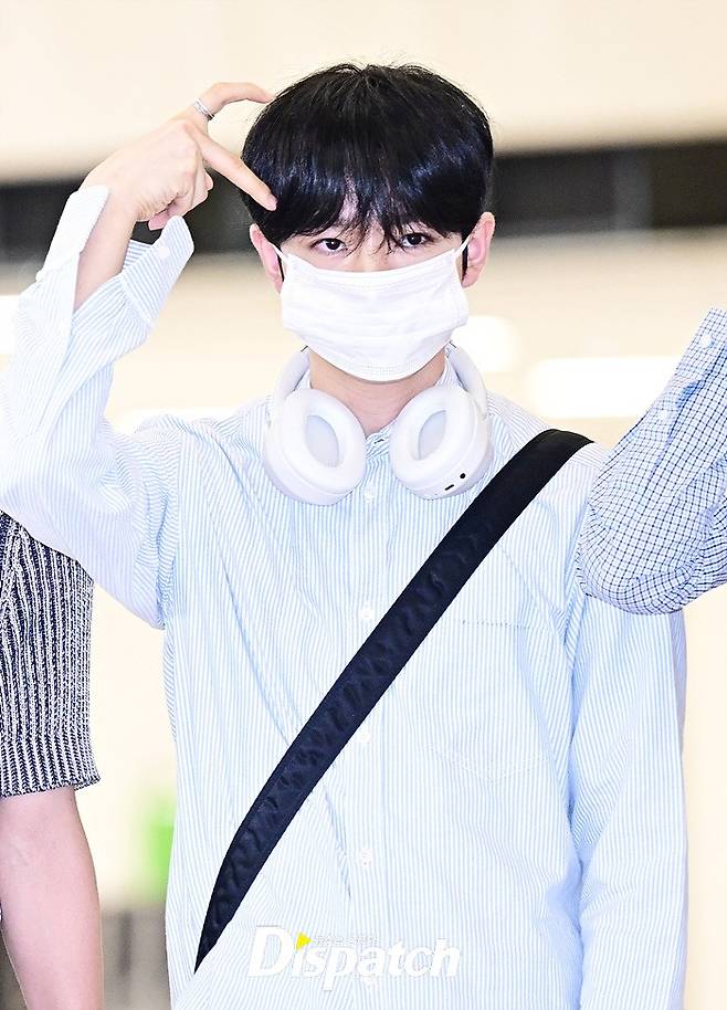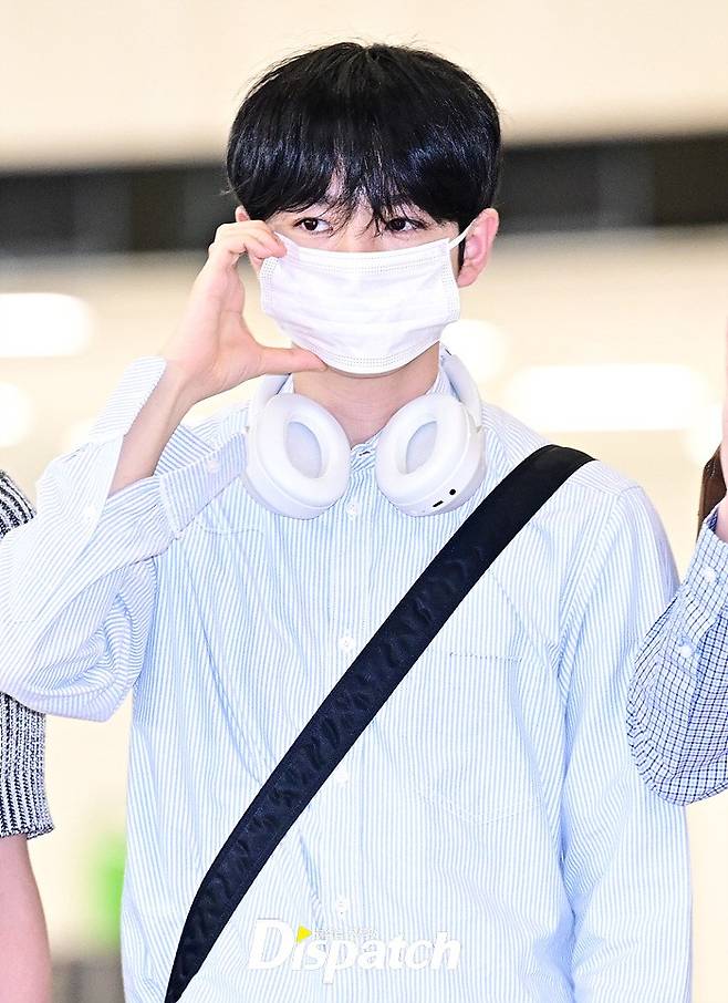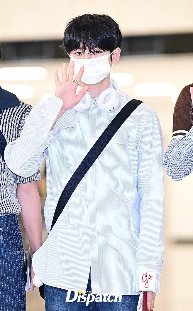 유우시는 스트라이프 셔츠와 데님진으로 캐주얼한 공항패션을 연출했다. 마스크에도 훈훈한 비주얼이 돋보였다.