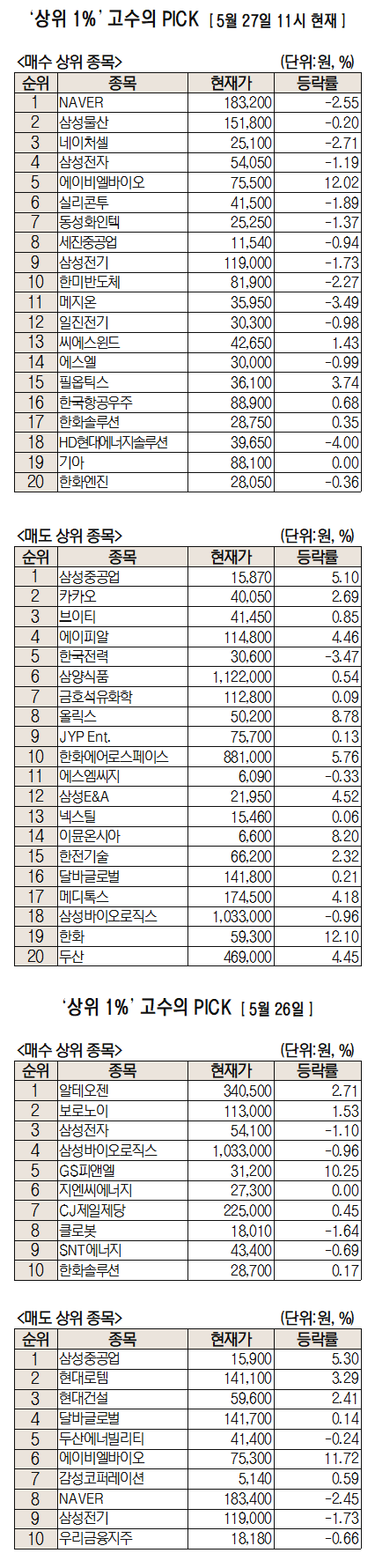 이날 미래에셋증권에 따르면 미래에셋증권 주식 거래 고객 중 최근 1개월간 투자수익률 상위 1%에 해당하는 ‘주식 초고수’들이 오전 11시까지 가장 많이 사들인 종목은 네이버다.