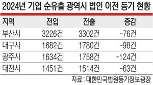 법원의 ‘상법 법인 본점 이전 등기 신청 현황’에 따르면 2020~2024년 비수도권 광역시 대부분이 기업 전입보다 전출이 많은 순유출 상태다. 부산은 지난해까지 최근 5년 연속 연간 3000건 이상 전출이 발생했으며, 2024년에도 전출 3302건으로 전입(3226건)보다 많았다. 대구는 2024년 전출 1780건, 전입 1682건으로 98건의 순유출을 기록했고, 광주와 대전도 각각 124건, 63건의 순유출을 보였다. 이들 4개 광역시는 모두 5년간 순유출 구조가 이어졌다. 반면, 수도권은 경기도(2391건)와 인천이 순유입을 기록했고, 서울은 순유출 양상이지만 전입 규모 자체는 여전히 크다.