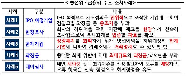 3년간 심사대상으로 선정된 IPO 기업 22개사 중 증권선물위원회(증선위)로부터 중조치 이상을 받은 3개사는 모두 상장이 유예됐고, IPO 직후 회계부정이 발견된 기업은 신속히 거래정지했다.
