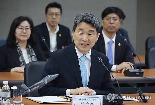 (사천=연합뉴스) 한상균 기자 = 이주호 대통령 권한대행 부총리 겸 교육부 장관이 27일 경남 사천 한국항공우주산업(KAI)에서 열린 우주항공산업 간담회에서 인사말을 하고 있다. 2025.5.27