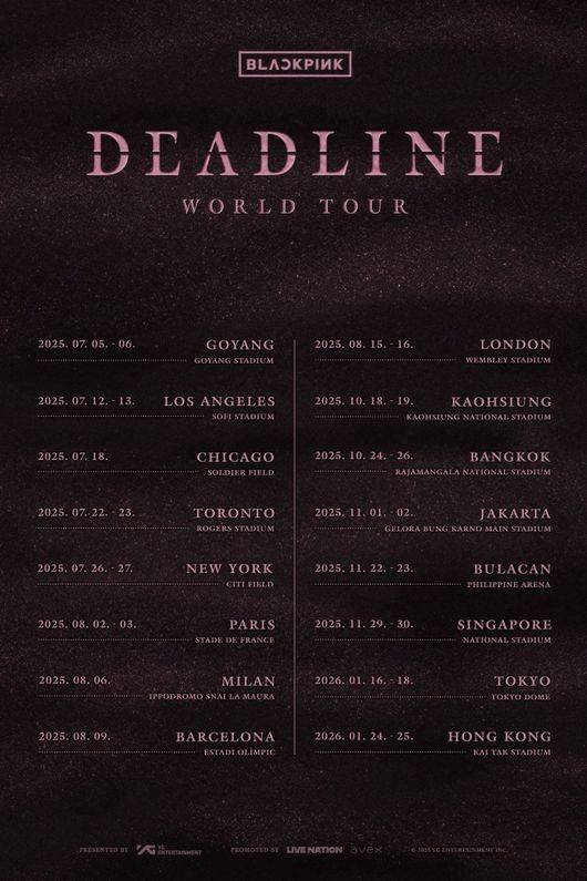 27일 YG엔터테인먼트에 따르면 블랙핑크는 'BLACKPINK WORLD TOUR 'DEADLINE''의 10월 18·19일 가오슝, 10월 24·25·26일 방콕, 11월 1·2일 자카르타, 11월 22·23일 불라칸, 11월 29·30일 싱가포르, 1월 24·25일 홍콩 공연을 추가로 개최한다.