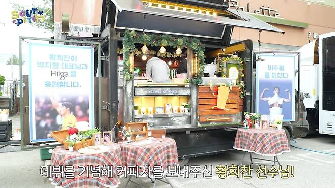 힛지스 멤버들은 촬영 도중 커피차가 왔다는 소식에 반가운 마음으로 달려갔다. 커피차를 보내준 주인공은 바로 황희찬이었다. 황희찬은 '황희찬이 박지영 대표님과 힛지스를 응원합니다'라는 문구와 함께 멤버들을 위해 음료와 간식을 준비했다.