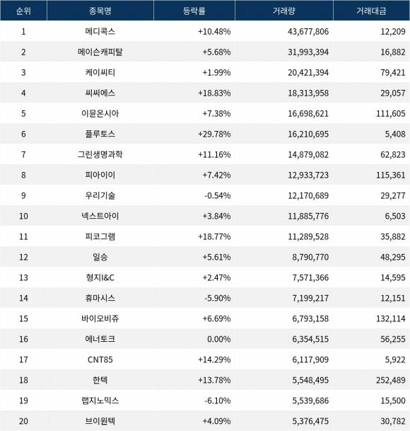 한편 거래량 상위 20위권 종목들은 피코그램(376180) ▲18.77%, 일승(333430) ▲5.61%, 형지I&C(011080) ▲2.47%, 휴마시스(205470) ▼5.90%, 바이오비쥬(489460) ▲6.69%, 에너토크(019990) 보합, CNT85(056730) ▲14.29%, 한텍(098070) ▲13.78%, 랩지노믹스(084650) ▼6.10%, 브이원텍(251630) ▲4.09% 등의 성적을 기록했다.