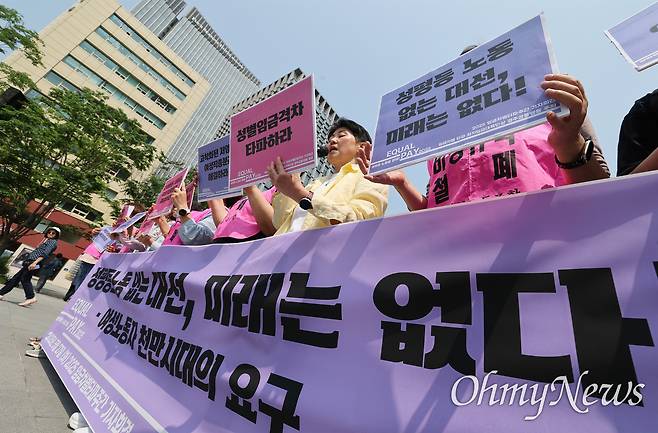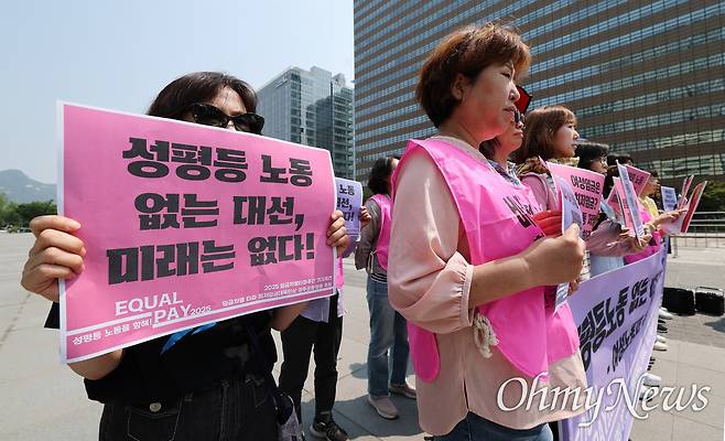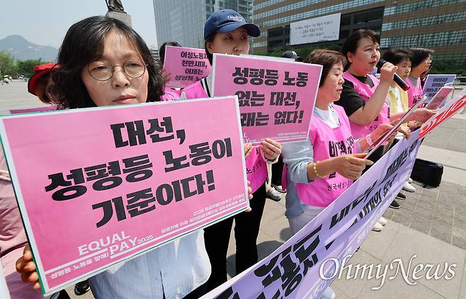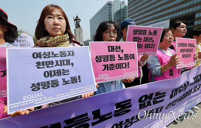 한국여성노동자회, 서울여성노동자회, 인천여성노동자회, 부천여성노동자회, 안산여성노동자회, 수원여성노동자회, 전국여성노동조합 주최로 27일 오전 서울 종로구 광화문광장에서 열린 '제9차 여성비정규직 임금차별타파주간 기념 기자회견. 성평등 노동 없는 대선, 미래는 없다-여성노동자 천만시대의 요구'에서 참석자들이 "유력 대선후보들은 성평등과 페미니즘이라는 이름에 입 닫고 귀 막으며 여성노동자들이 겪는 구조적 차별을 외면하고 있다"면서 성평등 노동 실현을 촉구하고 있다.