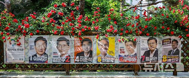 [서울=뉴시스] 정병혁 기자 = 제21대 대통령 선거를 일주일 앞둔 27일 서울 용산구 효창동에 위치한 한 아파트 화단에 심어진 장미꽃 밑으로 벽보가 걸려있다. 2025.05.27. jhope@newsis.com