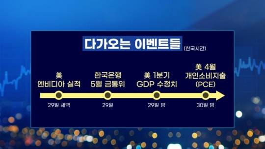*주요 이벤트 (한국시간) -美 5월 소비자신뢰지수 (27일 밤) -美 5월 FOMC 의사록 공개 (29일 새벽) -美 엔비디아·세일즈포스 실적 (29일 새벽) -한국은행 5월 금통위 (29일) -美 1분기 GDP 수정치 (29일 밤) -美 4월 개인소비지출(PCE) (30일 밤) -美 임상종양학회(ASCO) (30일)