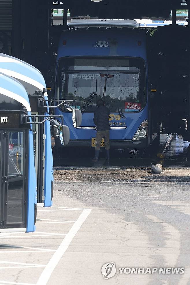 (서울=연합뉴스) 임병식 기자 = 서울 시내버스 파업 예고일을 하루 앞둔 27일 서울시의 한 공영차고지에서 버스 운행에 앞서 세차를 하고 있다. 2025.5.27