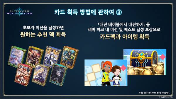 이와 함께 초보자 진입 장벽을 낮추기 위해 상세한 튜토리얼과 함께 연습모드에서 AI와 대전할 수 있는 기능을 선보일 예정이다. 초보자 미션을 달성하면 원하는 추천 덱도 획득할 수 있다.