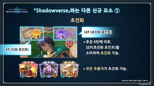 이번 신작에서 가장 큰 변화는 카드를 다양하게 활용하도록 유도하는 '초진화' 시스템이 추가됐다는 점이다. 초진화 시스템을 활용하면 이용자는 후공 6턴째 이후 SEP(초진화 포인트)를 소모해 카드의 공격력, 체력을 3씩 높일 수 있다. 초진화한 추종자로 상대방 추종자를 공격해서 처치하면 리더에게도 1피해를 준다.