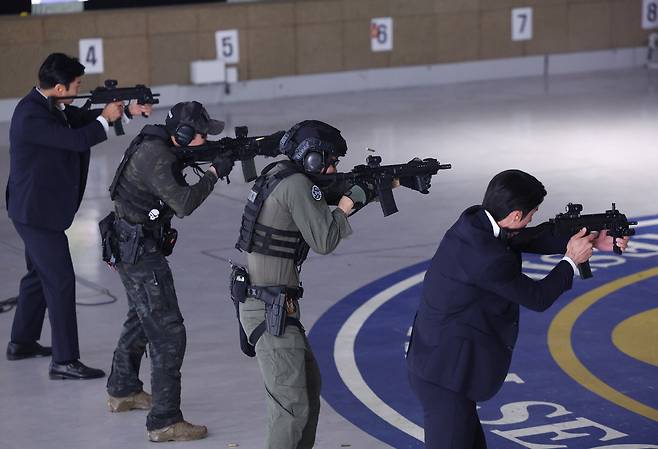 제21대 대통령 취임식을 일주일 가량 앞둔 27일 서울 강서구 대통령경호처 경호안전교육원에서 경호관들이 취임식 퍼레이드 모터케이드 및 특수 기동 훈련, 전술 사격 훈련, 위기 대응 종합조치 훈련 등 경호 훈련을 언론에 공개했다.
