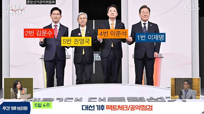 ◇ 최서윤> 네. 공직선거법상 법정 토론회에 초청 자격이 있는 4명의 후보를 집중적으로 살펴보려고 해요. 기후 대응과 경제 간의 조화, 특히 에너지 정책이 주를 이뤘는데요. 관련해서 공약을 살펴보면, 큰 틀에서 재생에너지 확대와 원전 확대를 놓고 의견이 갈립니다.