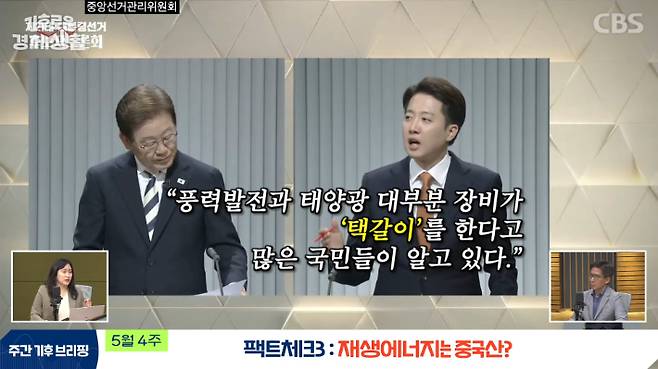 ◇ 최서윤> 예, 중요해 보입니다. 다음 쟁점도 볼게요. 말씀하셨지만 투표가 가까워지면서 선거가 네거티브전으로 치닫고 있어요. 그래서 나온 막말인 것 같긴 한데 살펴보지 않을 수가 없어서 가져왔습니다. 중국산 장비 문제. 김문수 후보 같은 경우에는 지나가는 말로 "내 운동권 친구들이 다 태양광 하고 있는데 거기가 비리의 온상이다"라는 얘기도 했고요. 이념적인 공격이었죠. 이준석 후보 같은 경우에는 두 번의 토론회에 걸쳐서 계속 중국 얘기를 했어요. 첫 번째 토론회에서는 "우리나라 지금 태양광 풍력 확대가 중국을 위한 거다"라고 말을 했고요. 두 번째 토론회에서는 아예 "국내 풍력발전과 태양광 대부분 장비가 중국산 장비 가져다가 '택갈이'를 한다고 많은 국민들이 알고 있다"라고 발언을 했거든요.