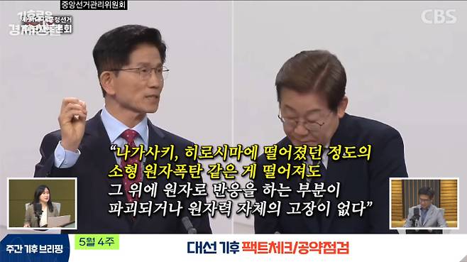 김문수 후보가 첫 TV 토론회에서 한 논란의 발언입니다. "나가사키, 히로시마에 떨어졌던 정도의 소형 원자폭탄 같은 게 떨어져도 그 위에 원자로 반응을 하는 부분이 파괴되거나 원자력 자체의 고장이 없다." 이렇게 말했어요. 많은 기사에 제목으로 실렸던 발언입니다. 교수님은 어떻게 생각하시나요?