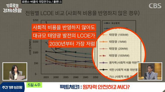 ◇ 최서윤> 균등화발전비용, LCOE라고 하면 발전소가 전기 1킬로와트시(kWh)를 생산할 때 들어가는 모든 비용을 수치화한 개념이에요. 그렇다면 폐기물 처리 비용과 위험 비용 등 모든 걸 단가에 계산해도 원전이 더 싸다는 주장, 맞습니까?