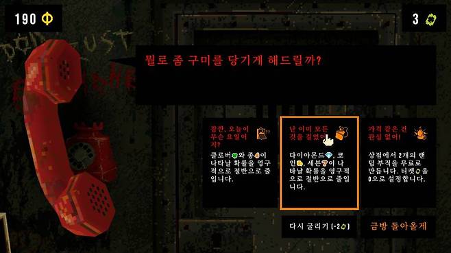 데드라인을 한 번씩 넘길 때마다 걸려오는 ‘전화’도 꽤 흥미로운 시스템이다. 전화는 횟수제한이나 조건이 있는 경우가 많은 ‘부적’과 달리 즉각적이거나 장기적인 효과를 제공하는 경우가 많다. 특정 심볼이 등장할 가능성을 즉시 감소시키는 경우도 있고, 가진 ‘클로버 티켓’을 모두 소모해 현재 상점에 있는 부적을 공짜로 만들 수도 있다.