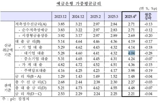 기업대출 금리(4.14%)도 0.18%p 낮아져 5개월째 하락세를 유지했다.