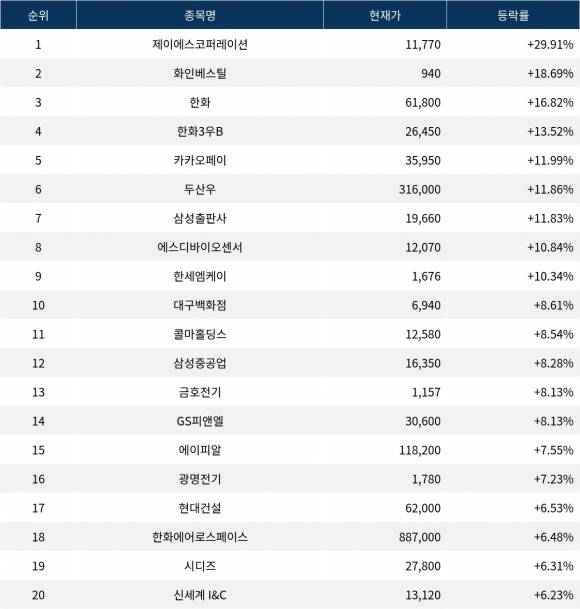 6위 두산우(000155)는 종가 316,000원으로 11.86% 상승 마감했다. 7위 삼성출판사(068290)는 종가 19,660원으로 11.83% 상승 마감했다. 8위 에스디바이오센서(137310)는 종가 12,070원으로 10.84% 상승 마감했다. 9위 한세엠케이(069640)는 종가 1,676원으로 10.34% 상승 마감했다. 10위 대구백화점(006370)은 종가 6,940원으로 8.61% 상승 마감했다.