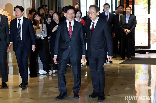 이 전 대통령과 김 후보는 이날 27일 서울 영등포구 한 호텔에서 오찬 회동을 가졌다. 김 후보는 윤재옥·이만희·김희정·신동욱 국민의힘 의원 등과 함께 이 전 대통령을 맞았다. 이 전 대통령이 차에서 내리자 김 후보는 "여기까지 멀리 오셨다"고 인사했다. 이 전 대통령은 김 후보 등을 한 손으로 감싸 안으며 함께 호텔 식당으로 걸어갔다.