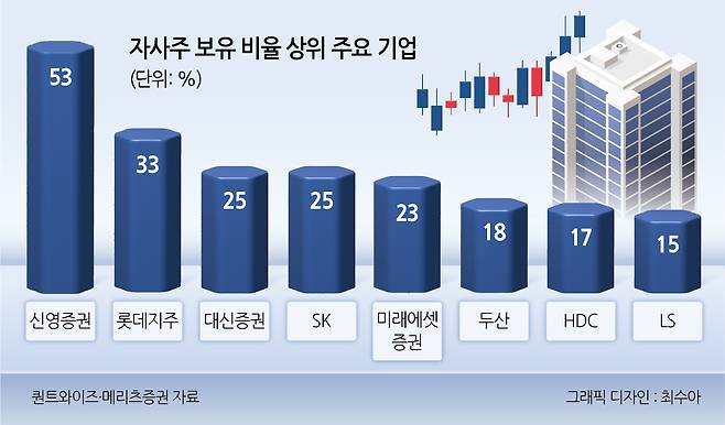 증권주 중에선 52%를 기록한 신영증권이 다른 종목과 비교하기 힘들 정도로 높은 자사주 보유 비율을 기록한 가운데, 대신증권(25%), 미래에셋증권(23%) 등도 상위권을 차지했다. 각 종목은 높은 자사주 보유 비율에 차기 정부의 증시 부양책에 대한 기대감까지 주가에 호재로 작용한 모양새다. 미래에셋증권, 신영증권, 대신증권 주가는 전날 종가 기준으로 올해 들어서만 각각 70.24%, 44.34%, 29.12%씩 올랐다.