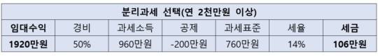 ▲ "월세 20만원 올렸는데 세금은 300만원 더 나왔어요" 근로소득자 A씨는 매달 160만원씩 월세 수입을 올리고 있었다. 연간 1920만원으로 분리 과세가 가능한 금액이다. 연간 임대소득이 2천만원 이하라면 분리 과세와 종합 과세를 선택할 수 있기 때문이다. 분리과세를 선택한 B씨가 내야 할 세금은 다음과 같다.