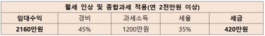 결과적으로 임대수익은 연 240만원 늘었지만, 세금은 314만원(420만-106만)이나 더 내게 됐다. 임대료 조금 올리려다 손해만 본 셈이 된 것이다.