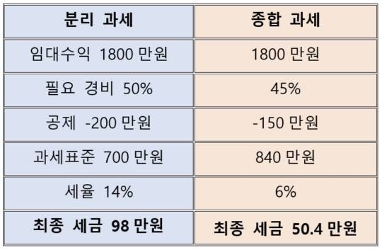 ▲ 분리 과세 vs 종합 과세…"세금만 보지 마세요" 연간 임대 수익이 2천만원 이하라면 분리 과세와 종합 과세 중 선택이 가능하다. 분리 과세는 세율이 14%로 고정된다. 2천만원을 초과한다면 종합 과세가 자동 적용된다. 근로소득 같은 다른 소득과 합산해 세율이 적용된다.