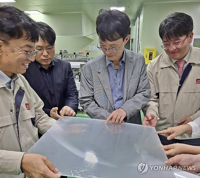 (대전=연합뉴스) 강성민 조달청 구매사업국장(가운데)이 27일 충남 공주시 소재 발광다이오드(LED) 조명업체인 소룩스를 찾아 생산 제품을 살펴보고 있다. 2025.5.27 [조달청 제공. 재판매 및 DB 금지]