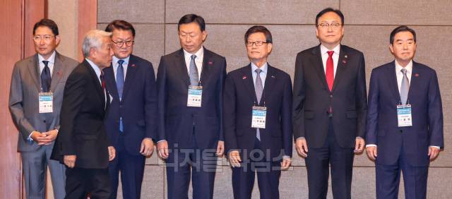 27일 서울 중구 롯데호텔에서 열린 제57회 한일경제인회의에서 기념촬영을 위해 아소 유타카 일한경제협회 부회장(아소시멘트 회장)이 한국 내빈들 앞을 지나 이동하고 있다. 왼쪽부터 조현준 효성그룹 회장, 아소 유타카 부회장, 박승희 삼성전자 사장, 신동빈 롯데그룹 회장, 윤진식 한국무역협회장, 정인교 산업통상자원부 통상교섭본부장, 김윤 한일경제협회 회장(삼양홀딩스 회장).