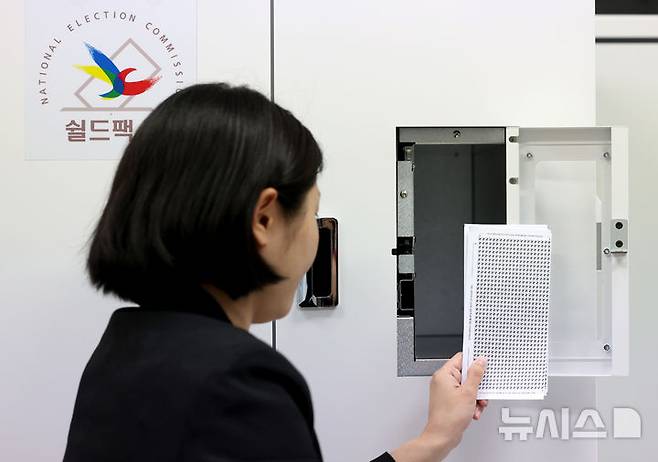 [서울=뉴시스] 김진아 기자 = 제21대 대통령 선거 선상투표가 실시되고 있는 27일 서울 종로구 서울시선관위 전산실에서 선관위 관계자들이 기표된 부분이 봉합된 상태로 수신되는 '쉴드팩스'로 전송된 투표용지를 접수하고 있다.