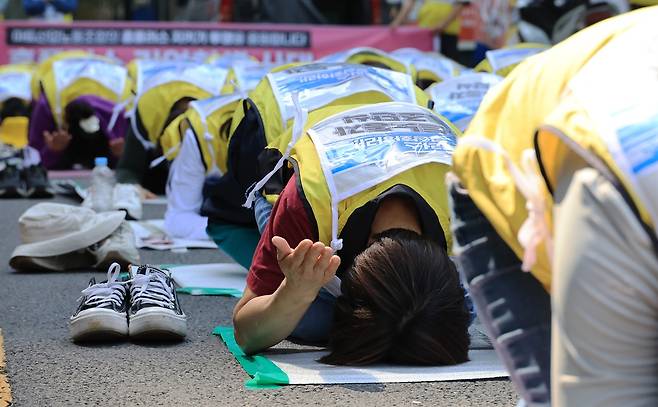 | ▲ 12일 서울 광화문 MBK 사무실 앞에서 홈플러스 정상화 촉구 기자회견을 마친 마트산업노조 홈플러스지부 조합원 등이 홈플러스 지키기 108배를 하고 있다. |