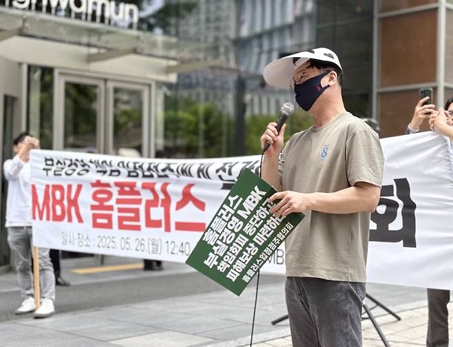 | ▲ 5월 26일 MBK 본사가 있는 광화문 D타워 앞에서 열린 '부실경영 책임 입점 점주에게 전가하는 홈플러스 규탄 집회’에 참석한 홈플러스 입점점주 이OO씨. |