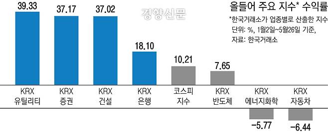 올들어 코스피 지수는 은행·증권·보험 등 금융주와 건설주, 유틸리티주가 주도하고 있다. 한국거래소가 업종별로 산출하는 KRX지수 중 한국전력 등 에너지 관련주를 모은 KRX유틸리티는 올해 39.33% 반등했다(26일 기준). KRX증권(37.17%), KRX건설(37.02%), KRX은행(18.10%) 등이었다. 같은 기간 10.21% 오른 코스피를 웃도는 성과다.