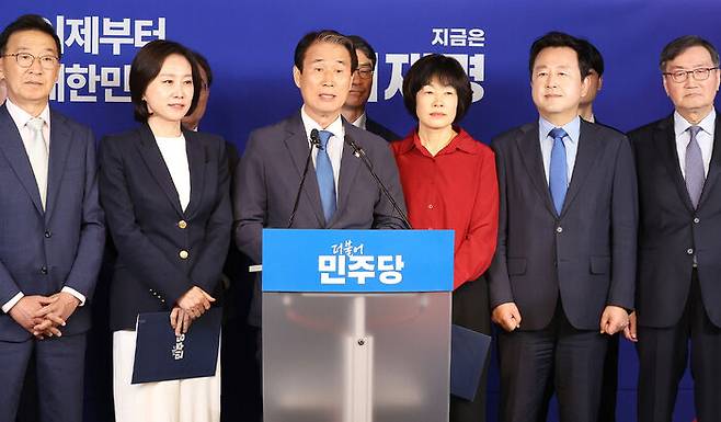 ▲ 27일 서울 여의도 더불어민주당 중앙당사에서 열린 '진짜보수 민주보수 공동선언'에서 권오을 중앙선거대책위원회 국민대통합위원장과 허은아 전 개혁신당 대표, 최연숙 대구시당 선대위원장 등 참석한 인사들이 선언문을 낭독하고 있다.