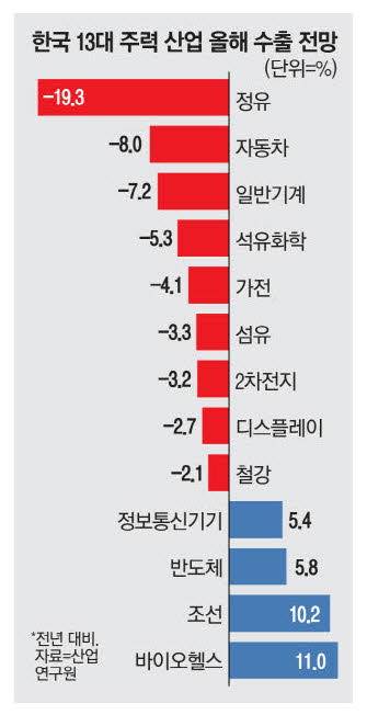 정유·가전·2차전지 … 韓 주력산업 13개 중 9개 수출 먹구름