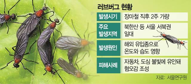 2022년부터 서울과 경지 지역에 출몰한 이른바 ‘러브버그(붉은등우단털파리)’가 올 여름에도 기승을 부릴 전망이다. 기상청이 올 여름이 예년 보다 덥고 6월 강수량이 평년 대비 많을 것이라 전망하는 등 러브버그의 대량 번식 환경이 조성됐기 때문이다. 서울시와 각 자치구는 러브버그 대책 방안을 잇따라 내놓고 있지만 서울시와 지자체간의 협업체계 구축 등 대책의 효율성을 높여야 한다는 지적이 커지고 있다.