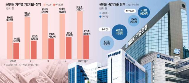 한국은행 경제통계시스템에 따르면 올 1분기 말 기준 국내 은행권의 국내 기업대출 잔액은 1400조 2238억 원이다. 이 가운데 수도권(서울·경기·인천) 기업대출 잔액은 934조 3593억 원으로 전체의 66.7%에 이른다. 1년 전(66.5%)과 비교해 수도권 비중이 0.2%포인트 증가했다.