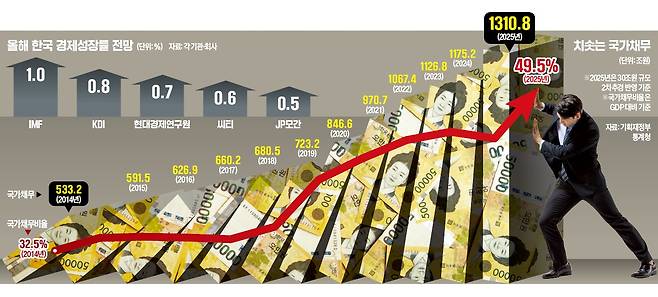 30조원 규모로 예상되는 2차 추경 재원을 전액 적자 국채로 조달하면 국가채무는 올해 말 1310조8000억원까지 불어날 전망이다. 국내총생산(GDP) 대비 국가채무비율은 49.5%로 역대 최고로 높아질 것으로 예상된다.