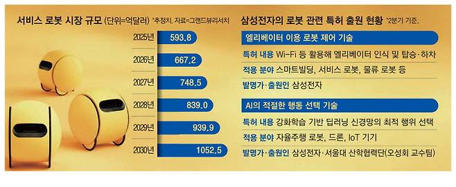삼성전자가 이처럼 로봇 기술에 박차를 가하는 까닭은 관련 시장이 팽창하고 있어서다. 그랜드뷰리서치에 따르면 서비스 로봇 시장 추정 규모는 올해 593억달러에서 2030년 1052억달러로 약 77% 성장할 것으로 전망된다. 또 로봇은 산업 자동화에 투입할 수 있는 만큼 생산성 향상에도 보탬이 된다.