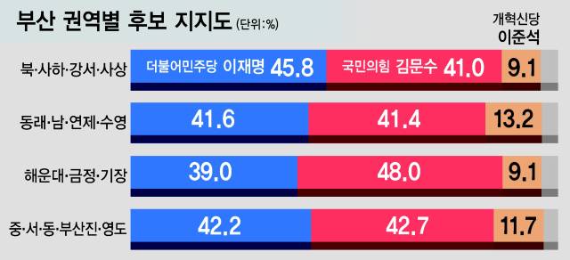 정당 지지율은 국민의힘(42.6%)이 민주당(35.4%)을 오차범위 밖에서 앞서는 것으로 나타났다. 다만 서부권(북구·사하구·강서구·사상구)에서 오차범위 이내지만 민주당(39.6%)이 국민의힘(39.1%)을 근소하게 앞서는 결과가 나왔다.