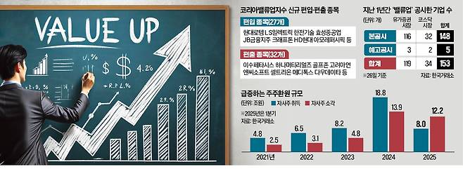작년 5월 말 시행된 금융당국의 밸류업(기업가치 제고) 프로그램이 27일로 1주년을 맞았다. 유가증권시장에서 밸류업 공시에 나선 기업의 시가총액이 전체 코스피지수 시총의 절반에 육박한 것으로 나타났다. 자사주 매입 및 소각액은 1년간 두 배 넘게 늘었다.