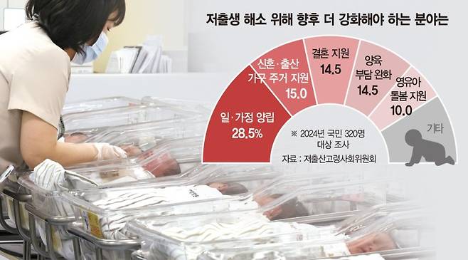 27일 저출산고령사회위원회에 따르면 지난해 국민 320명을 대상으로 실시한 설문조사 결과 '저출생 정책과 관련해 향후 더 강화해야 할 분야'로 일·가정 양립(28.5%)이 꼽혔다. 저출산 문제 해결을 위해선 무엇보다 경력단절 없이 아이를 키울 수 있는 환경을 만들어달라는 주문이다.