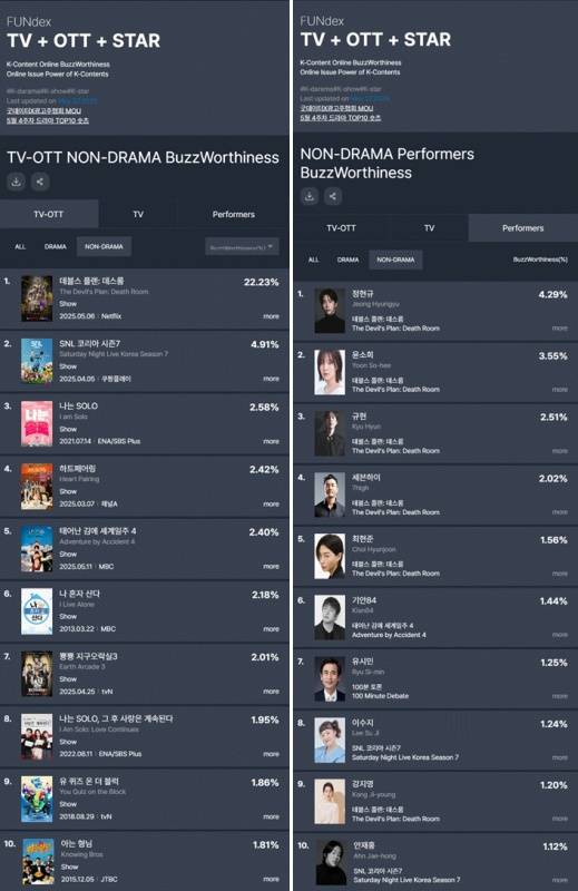 27일 굿데이터코퍼레이션 펀덱스(FUNdex)에서 발표한 5월 4주차 TV-OTT 통합 비드라마 화제성 부문에서 넷플릭스의 ‘데블스 플랜: 데스룸’이 2주 연속 1위에 올랐다.